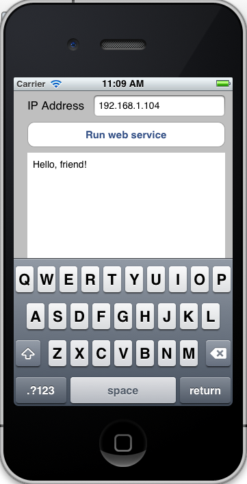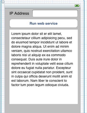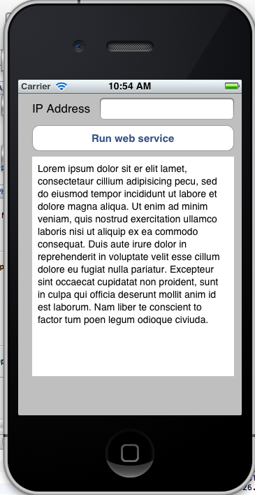 Here we define the same controls that we used in Android demo - one TextField for entering IPAddress of the server, one TextView where we should display the response from server and a button, that will trigger web service call. I will not describe why and how Objective-C is used to define these - there are plenty of books and demos on the net to find this out.